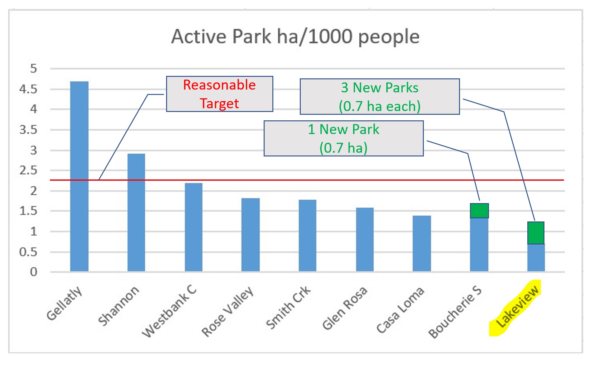 It turns out that our community fares especially badly with respect to active parks (see Fig #1 & Fig #2) Recall that LHCA comprises the city-designated areas of Lakeview Heights and S. Boucherie. Without bold action our situation will only get worse as the population increases, infill housing continues, and our demographics move towards younger families.